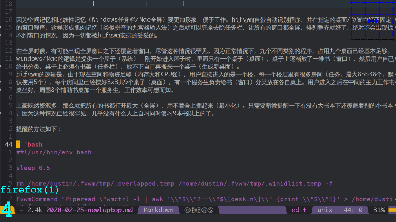 因为空间记忆相比线性记忆(Windows任务栏/Mac全屏)要更加形象,便于工作。hifvwm自带自动识别程序,并在指定的桌面/位置中打开固定的窗口程序,这样形成肌肉记忆(类似拼音的九宫格输入法)之后就可以完全去除任务栏,让所有的窗口都全屏,排列整齐就好了,绝对不会出现找不到窗口的情况,因为一切都被hifvwm安排的妥妥的。